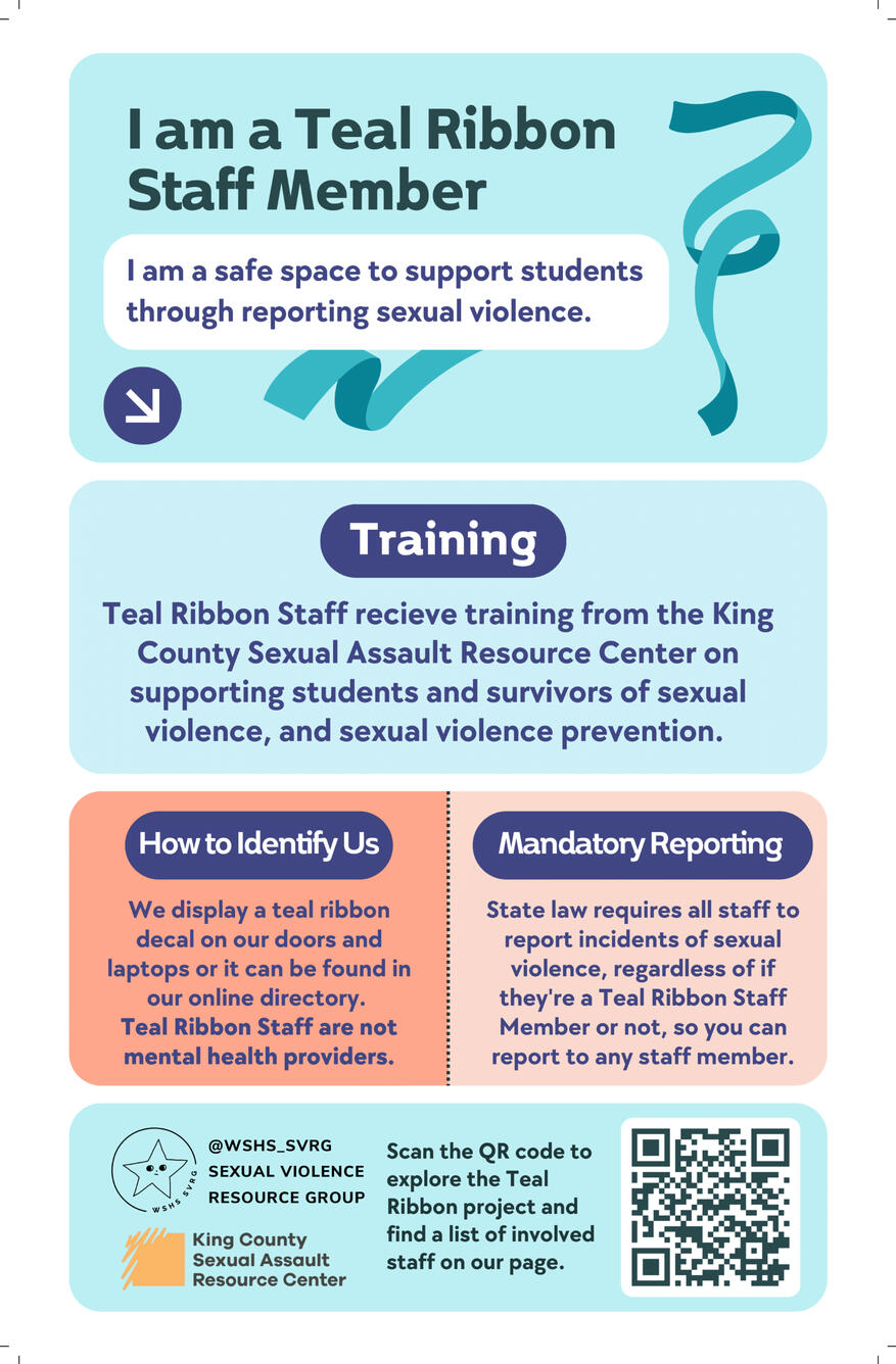 A program by the SVRG in partnership with the King County Sexual Assault Resource Center(KCSARC), dedicated to promoting sexual violence prevention and creating safe spaces for students. The Teal Ribbon Project debuts in the 2024-2025 school year, and will be a continuous project throughout the coming years.The Teal Ribbon Project allows for staff members to become designated safe spaces for students to support them through the sexual violence reporting process. Participating staff receive training from the King County Sexual Assault Resource Center on supporting students and survivors of sexual violence, and sexual violence prevention.Upon completing the optional training, those staff become Teal Ribbon Staff Members, and are given teal ribbon stickers to display outside their room doors (some will display on nameplates) and laptops, along with a recognizable poster.